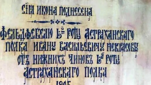 Икона с дарственной надписью "фельдфебелю 1-й роты Астраханского полка Ивану Васильевичу Некрасову от нижних чинов", 3 сентября 1905 года.