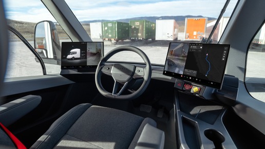 Tesla Semi с запасом хода в 800 километров оснащена батареей емкостью 900 кВт⋅ч. Она может похвастаться эффективностью 1,0 кВт⋅ч на километр при полной массе автопоезда 37 200 килограммов, что позволяет ей проехать до 804 километра на одном заряде. Приводимый в движение тремя независимыми электродвигателями, установленными на задней оси, он развивает мощность 811 лошадиных сил и может разгоняться от 0 до 100 км/ч примерно за 20 секунд. Не совсем Model S Plaid. Никто и не ожидал этого. Почему Tesla разместила водителя в центре кабины...