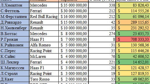 В наше время в Формула-1 из спорта энтузиастов стала достаточно мощной бизнес-империей, в связи с чем действия каждого участника этого вида спорта так или иначе оценивается на эффективность не только подсчетом побед, подиумов или быстрых кругов, но и вложенных средств в участие этих участников. Эффективность гонщиков на трассе оценить проще всего, потому что показателем их эффективности является количество набранных ими очков. Количество вложений (зарплата по контракту) более-менее достоверно известна, так как информация о зарплатах гонщиков обычно имеется в открытом доступе...