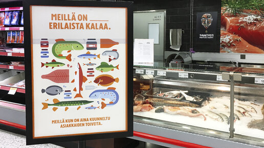 How much is the fish? — поется в знаменитой песне группы Scooter. Об этом сейчас и узнаем. Для фоторепортажа мы специально выбрали два крупных гипермаркета — K-Citymarket и Prisma. Специализированные магазины рядом с границей мы не стали рассматривать, так как, по заявлению многих покупателей, там и цены чуть выше и качество чуть ниже. Впрочем, сравнивайте сами. Конечно, основная рыба — это лосось (lohi) и радужная форель (kirjolohi). Вот, и та, и другая красуются на прилавке, лосось — 23,50...