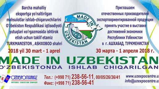Национальная промышленная выставка отечественных предприятий и производителей экспорто- ориентированной продукции «Made in Uzbekistan» в г. Ашхабад (Туркменистан) НВК «Узэкспоцентр» приглашает принять активное участие на Национальной промышленной выставке отечественных предприятий и производителей экспортоориентированной продукции «Made in Uzbekistan», которая состоится с 30 по 01 апреля 2018 г. в зале Торгово-промышленной палаты Туркменистана в г.Ашхабад. АО НВК «Узэкспоцентр» ведет организационно-подготовительную работу по данной выставке...