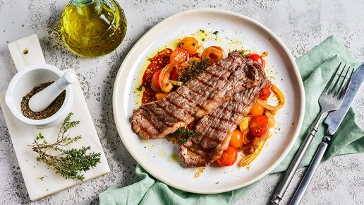 Стейки «минутка» достаньте из холодильника и дайте им полежать в упаковке при комнатной температуре примерно 20 минут. Это необходимо для правильной прожарки. Пока стейки доходят до комнатной температуры, приготовьте быстрый мини-гарнир. Очистите и нарежьте репчатый лук кольцами толщиной в полсантиметра. Помидоры черри разрежьте вдоль пополам. Разогрейте сковороду с оливковым маслом. Добавьте в нее луковые кольца, посыпьте их сахаром и обжаривайте, помешивая, на среднем огне примерно 5 минут, пока лук не карамелизуется...