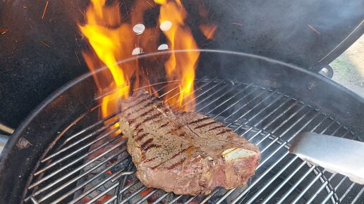 И вот выходные, а это значит, что пришла пора доставать свой старый-добрый гриль. В прошлый раз я писал, что мною от компании стейк&хоум был получен чудесный стейк портерхаус. Чудесен он прежде всего тем, что является 2 в 1. Одна часть (та что побольше) - это мясо из тонкого края туши бычка, а вторая (та что поменьше) это вырезка из которой делают филе миньон. Посередине их разделяет Т-образная кость. Ну что... угли в стартере набирают жар, стейк вынут из вакуумной упаковки, просушен бумажными полотенцами и лежит прогревается до комнатной температуры...