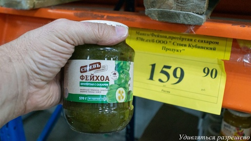 В Светофоре магазине по цене 159 р. за банку встречена была фейхоа, протёртая с сахаром. Стоевъ произвёл. Попробовали и честно рассказал