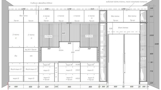 ⬇️ ✔️Материал: пластик FunderMax, Шпон ✔️Цвет:L030 LO матовый светло-серый, L036 LO матовый темно-зеленый, американский орех ✔️Размеры: 5640мм, 2400мм(остров) ✔️Высота: 3200мм ✔️Фурнитура: BLUM ✔️Подсветка врезная LED ✔️Внут.ящик...