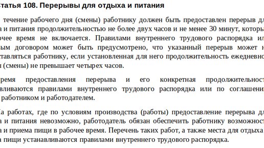 Ст. 108 ТК РФ: официальный текст Скачать ст. 108 ТК РФ Статья 108 ТК РФ: общие комментарии Требования, определенные в статье 108 ТК РФ, вытекают из нормативов по охране труда. В данном случае забота законодателей о работниках выражается в предоставлении им права иметь обеденные перерывы в ходе выполнения трудовых обязанностей. Формально обеденные перерывы нужно использовать для отдыха и приема пищи. Вместе с тем никому не вменяется в обязанность контролировать, как именно использует их работник...