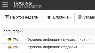 Адрес календаря событий на русском языке: https://ru.tradingeconomics.com/calendar Очень полезный сайт для всех интересующихся экономикой, в т.ч. для "инвесторов", тратящих свои деньги на разнообразных торговых площадках. Можно выбрать страну или страны, даты, а также важность событий. Например, на этой неделе в Зимбабве ожидаются только новости по инфляции: Вроде ничего пугающего в данном уровне инфляции в 2024 году. Если мы выберем вместо "На этой неделе" опцию "Обычай" (сразу видно, слово "Custom"...