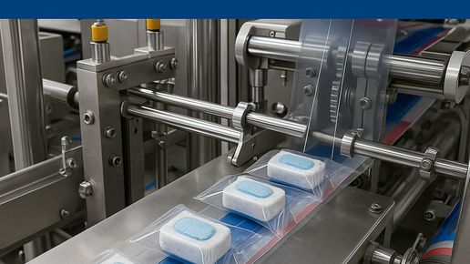 Упаковка таблеток для ПММ — одна из самых сложных задач в бытовой химии: высокая скорость, штучный продукт, жёсткие требования к геометрии и качеству пакета.