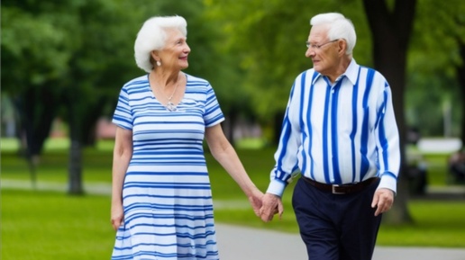 В парке прогуливалась пожилая пара. Шли рядом, соблюдая некоторую отстранённую дистанцию друг от друга. На нём - рубашка в горизонтальную синюю с белым полоску, а на ней - платье в такую же, только вертикальную, даже оттенки подобраны одинаковые. Стало вдруг интересно, противоположности в паре всё-таки притягиваются или расходятся в разных направлениях? Жизнь для обоих превращается в клетку или имеет устойчивую структуру типа "квадрат"? Молча и не спеша идут рядом... Может для них совместная жизнь клетка, в которую они когда-то попали, а теперь уже нет сил на какие-то глобальные изменения...