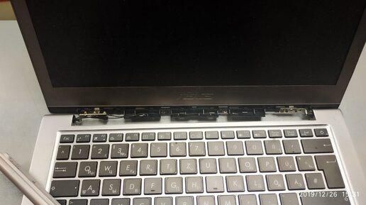 Достаточно частая поломка для этой модели ноутбука - отвалилась петля крышки матрицы от самой крышки, из за чего выломало декоративную накладку закрывающую петли и шлейфа, идущий в крышку матрицы из корпуса ноутбука. С внешним то видом ладно, не страшно, а вот то что петля отломилась - это проблема. Крышку ни открыть ни закрыть нормально не получается, да еще и риск оборвать кабеля такой совсем не маленький появился. Ну в общем мириться с этим нельзя, нужно ремонтировать. Разбираем, делаем. Снимаем...