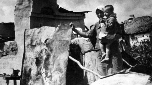 Жители деревни Кочетовка на пепелище родного дома после боев на Курской дуге. Место съемки: Кочетовка, Курская область, СССР Время съемки: июль 1943 Автор: Николай Фиников