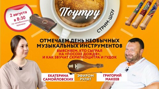 Традиционное пятничное стрим-шоу «Поутру» в этот раз будет посвящено Дню необычных музыкальных инструментов. Зрители от хранителя фондов Государственного исторического музея Южного Урала Константина Дружинина узнают об уникальной коллекции инструментов, одним из которых является скрипкоцитра «Виолон». Мастер-ремесленник Наталья Прокофьева объяснит, что такое «Посох дождя» и как на нем можно играть...