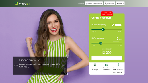 Получить займ в Vivus можно на сумму до 30000 рублей на личную банковскую карту под 0 % на срок до 21 дней Без залога и поручителей...
