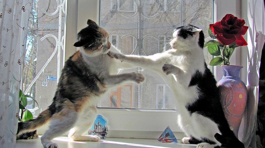 Если кто-то думает, что только коты умеют вот это вот "МЯЯЯ-ааа-аа-а", то он ошибается. Кошки это умеют тоже. И нашипеть, и нарычать, и наплеваться друг на друга. Правда, голоса у них тонкие и не такие громкие, так что кошачьи конфликты выглядят более комично. Однако, ссорящиеся кошки в некоторых моментах превосходят котов. И к активным действиям, то есть непосредственно к драке, кошки переходят не реже. Пожалуй, даже чаще. То есть конфликты кошек словесной перепалкой не ограничиваются. Только дерутся они недолго, и совсем не так сильно, как коты...