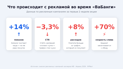 С 9 апреля что-то пошло не так. Бюджет заканчивается раньше обычного, показы растут, а заказов больше не стало. Если вы это заметили, вы не одни. Разберём что происходит и как это исправить без паники. 9 апреля Wildberries запустил акцию для покупателей: за каждые 100 рублей в заказах начисляется билет, плюс билеты можно находить прямо в поисковой выдаче. Накопил от 10 билетов и участвуешь в розыгрыше квартир, техники, путешествий. Акция идёт до 21 мая. Для покупателя это игра. Для селлеров — новая переменная, которая уже ломает экономику рекламных кампаний...