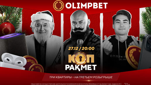 27 декабря завершается главная акция года от самого щедрого казахстанского букмекера – «Көп рақмет». Не пропустите розыгрыш в прямом эфире на канале Olimpbet Play. Рекордсмен книги рекордов Гиннесса, острый на язык стендапер, роскошная ринг гел и щедрый Дедушка Мороз будут ждать в прямом эфире участников «Көп рақмет» от Olimpbet. В ближайшую среду пройдет заключительный розыгрыш акции. Главные призы – три квартиры в Астане. Кроме того, будет разыграна третья часть огромного призового фонда. Это ноутбуки, смарт-телевизоры, игровые приставки, умные часы, колонки, другие призы и тысячи фрибетов...