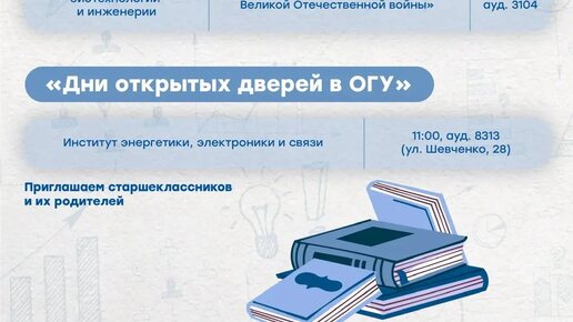⭐️ ОГУ имени В. А. Бондаренко приглашает школьников и родителей 25 апреля. Узнай о современных специальностях, задай вопросы преподавателям и почувствуй атмосферу студенчества. День открытых дверей: 📍 Институт энергетики, электроники и связи – в 11:00, аудитория 8313, улица Шевченко, 28. Университетские субботы:...