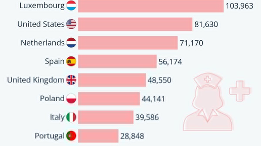 На диаграмме показана средняя заработная плата медсестры в разных странах с использованием последних данных ОЭСР с обменным курсом по паритету покупательной способности, используемым для учета различий в стоимости жизни между странами...