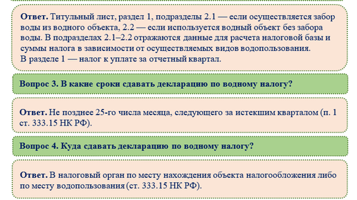 Пять вопросов по декларации Налогоплательщика, столкнувшегося с необходимостью расчета налога и представления инспекторам отчетности, в первую очередь волнуют вопросы о том, кто сдает декларацию по водному налогу, в какой форме и в какой срок. Получить общее представление о декларации по водному налогу поможет короткая анкета: Далее расскажем подробнее об особенностях оформления декларации и сроках ее сдачи. С актуальными ставками водного налога вы можете ознакомиться на сайте «КонсультантПлюс», оформив бесплатный доступ к системе...
