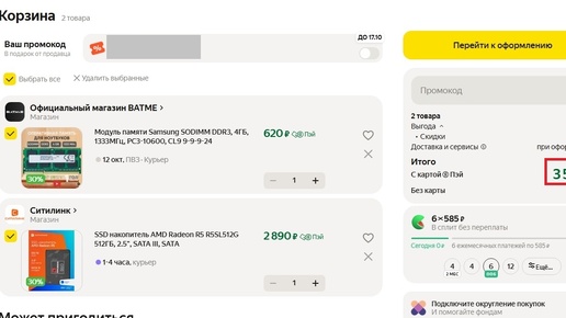 Здравствуйте, гости, и подписчики моего канала! Сегодня решил оживить старый ноутбук, и заказать SSD диск на 512 Гб., и пару планок ОЗУ DDR3 по 4 Гб. (это максимальное количество оперативной памяти, которое поддерживает старенький ноутбук Асус K52F). Подобрал себе эти товары на Яндекс Маркете, предварительно почитав отзывы о продавцах, чтобы не нарваться на подделки. Продавцы, вроде, солидные, Ситилинк и какой-то официальный магазин Ватме или Бэтме... Положил товары в корзину, выбрал для доставки удобный мне пункт выдачи и перешёл на вкладку оплаты (оформление заказа)...
