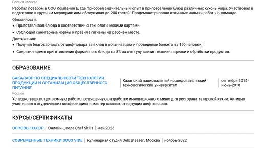 Ищете качественный пример резюме су-шефа в ресторан, чтобы составить свое? Изучение готовых примеров — лучший способ создать эффективное резюме, которое поможет вам быстро получить желаемую работу на кухне.🔪 В этом материале вы найдете все необходимое для составления сильного резюме су-шефа: Все эти советы помогут вам адаптировать ваше CV под конкретную вакансию. Так ваше резюме выделится среди кандидатов. Изучив пример, вы сможете создать резюме с помощью нашего конструктора резюме.👨🍳 Заголовок...