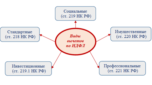 Стандартные, социальные, имущественные и другие вычеты по НДФЛ: полный перечень видов и условия их предоставления Физические лица при соблюдении определенных условий могут рассчитывать на стандартные, инвестиционные, социальные, имущественные и профессиональные налоговые вычеты. Виды налоговых вычетов и условия их предоставления описаны в ст. 218-221.1 НК РФ. На рисунке ниже показано пять основных видов налоговых вычетов с указанием статей НК РФ, в которых описаны механизмы получения: ВАЖНО! Новой ст...