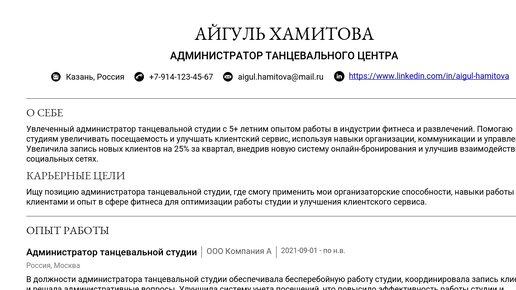 Пример резюме Администратора танцевальной студии 2025 - Как составить