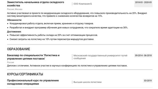 Изучите этот пример резюме начальника отдела складского хозяйства, чтобы понять, как составить по-настоящему эффективную анкету. Используя готовые примеры, вы сможете быстро создать документ, который поможет вам получить желаемую работу 🚀. В этой статье вы найдете пошаговые инструкции и готовые примеры для создания эффективного резюме как для начинающих, так и для опытных начальников отдела складского хозяйства. Мы подробно рассмотрим, как выгодно представить с учетом требований работодателей. Вы...