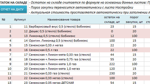Программа складского учета обладает следующим набором функций: учет прихода и ухода товара, отображение актуального остатка на складе, оповещение о необходимости закупки номенклатуры, отчет о передвижении продукции на дату. Также реализована простая система заведения перечня товаров по категориям. Формирование отчета за выбранный временной период позволяет удобно консолидировать данные для анализа. Ссылки для скачивания программы и инструкции: На просторах интернета существует большое разнообразие программ складского учета продукции, учета остатков товара...