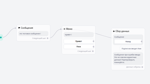 В этой статье я расскажу как сделать бота в конструкторе, на примере конструктора я возьму этот сайт . Для начало надо пройти регистрацию через почту , а остальные этапы можно пропустить . За тем нужно войти на вкладку "Чат-боты" и создать бота. Там вы увидите поле для создание бота. и инструменты для поведения бота. Перетаскивая Сообщения,Меню и т.д на поле вы можете создать цепочку. после того как все сделали ,надо нажать сохранить. после вам выйдет окно как его запустить...