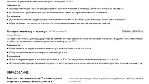 Пример резюме мастера в салон красоты поможет вам увидеть, как выглядит успешный документ, который привлекает внимание работодателей. Изучение готовых примеров — это самый эффективный способ быстро составить собственное резюме и получить работу своей мечты. На этой странице мы предлагаем готовые примеры для мастеров разного уровня опыта, а также пошаговые инструкции по заполнению каждого раздела. Вы узнаете, какие , чтобы максимально увеличить шансы на успех. Изучив пример, вы сможете создать резюме с помощью нашего конструктора резюме...