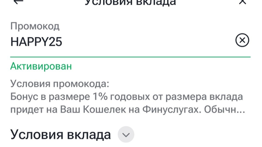 ⚡ На Финуслугах появился промокод HAPPY25 – дает +1% к ставке по вкладам для всех клиентов Лучший вклад для использования промокода старым клиентам: ➡️ 16.1% «Оптимальный +» Совкомбанк на 90 дней, от 10 тыс. до 50 млн. руб С учетом бонусного 1% имеем по нему 17.1% годовых 👉 Также есть смысл отслеживать появление вклада "Подарок" от Дом РФ (16.5% на 91 день) ➡️ 30% - «Надежный Промо» от ДОМ РФ, 1 мес, 10-100 тыс.₽ ➡️ 30% - «Надежный Прайм» от ДОМ РФ, 3-6 мес, 10-100 тыс.₽ ➡️ 30% - «Локо-Вклад...