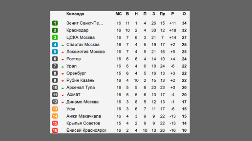 Футбол. Чемпионат России. 16 тур. Результаты. Таблица. Расписание.