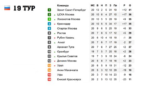 Футбол. Чемпионат России. РПЛ. 19 тур. Результаты. Таблица. Расписание.