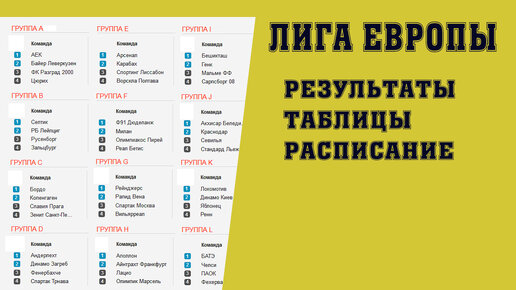 Привет всем любителям футбола, это обзор на результаты матчей в ЛЕ. Также будут таблицы групп, расписание будущих матчей, и лучшие голеодоры. Группа A Здесь Байер принимал АЕК, тут забивали футболисты, на которых большие надежды полагают оба клуба, это Кай Хаверц из Байера у него в игре гол + пас, и он забивает 3 мяч в этой ЛЕ, и у Аека выделю Ивана Триковски. Он, помним в квалификации забил за АЕК 6 мячей, 4 из них Штурму, про отбор мы делали под касты на спортивном, эта фамилия должна быть вам знакома...