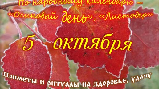 Сегодня 5 октября 2023 года, 278 день 2023 года по григорианскому календарю, 22 сентября юлианского календаря (по старому стилю). 21-й лунный день. 20 Солнечный День 8 солнечного месяца, Месяца Справедливости, выбора между Добром и Злом. Приветствую тебя мой гость. Сегодня День недели - четверг, да не простой, а День «Ветра Листодера». К этому дню опадало большинство листьев с деревьев. Листопадная была началом настоящей осени. По опавшим листьям крестьяне определяли, какой будет погода зимой. Так, если осиновые листья ложились лицевой стороной кверху, зимой следовало ждать лютых холодов...