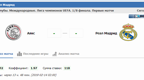 Аякс : Реал - прогноз и ставка на матч 13 февраля 2019