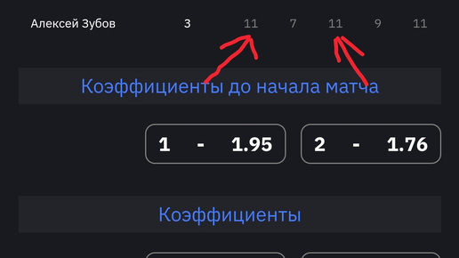 Данная стратегия заключается в поиске матчей лайве, где текущий счет по сетам составляет 2-2. При этом в "Статистике H2H" должна наблюдаться закономерность. На этом примере в "Статистике H2H" мы видим следующее: 1. 60% побед в очных встречах было у Алексея Зубова 2. Первый сет в 60% случаях был выигран Алексеем Зубовым 3. Второй сет в 60% случаях был выигран Антоном Скобловым 4. Третий сет в 60% случая был выигран Алексеем Зубовым То есть видна следующая закономерность, что процент побед в первом и третьем сете совпадает с процентом общих побед...