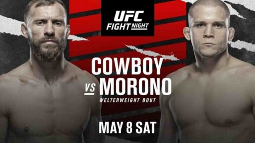 8 мая 2021, «UFC APEX», Лас-Вегас, штат Невада, США Дональд «Cowboy» Серроне (36-15) – Алекс «The Great White» Мороно (18-7) Бой в полусреднем весе – до 77 кг Добро пожаловать на родео! Дональд «Ковбой» Серроне попытается оседлать «быка», в роли которого на этот раз выступит Алекс Мороно. Данный поединок станет вторым по значимости на турнире UFC on ESPN 24. Серроне – опытнейший ветеран UFC, переживающий не лучшие времена в карьере. Дело в том, что 38-летний американец проиграл четыре боя подряд...