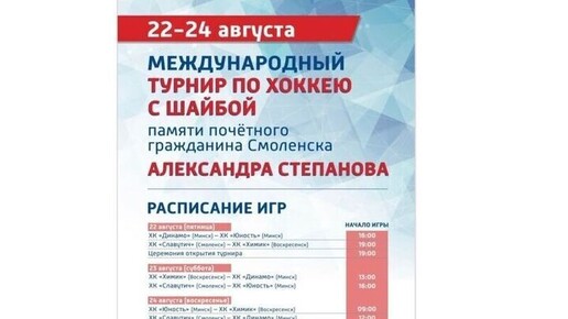 С 22 по 24 августа во Дворце спорта «Юбилейный» пройдет IV Международный турнир по хоккею с шайбой среди юношеских команд, посвященный памяти почетного гражданина Смоленска Александра Степанова. Александр Петрович внес большой вклад в развитие хоккея в регионе: в трудные времена он поддерживал студенческую команду «СГАФКСТ‑Монолит» (ныне «СГУС») и был одним из основателей профессионального клуба «Славутич», поэтому турнир стал не только площадкой для соревнований сильнейших хоккейных школ, но и выражением уважения к человеку, верившему в смоленский хоккей...