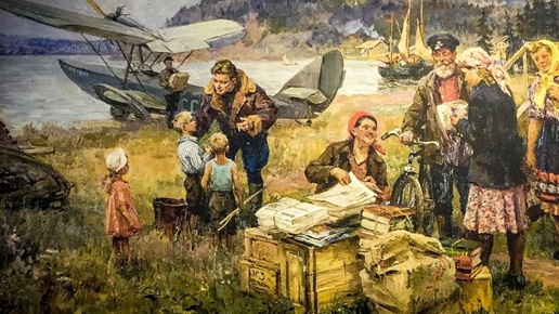 Минутка краеведения. Попалась на глаза интересная картина художника Леонида Байкова «Доставка почты в Карелии в 1930-х». Как раз к сегодняшнему Всемирному дню почты. Естественно, полотно написало в стиле соцреализма. Девушка-почтальон вручает письма и прочую корреспонденцию радостным деревенским жителям, а летчик объясняет что-то местным пацанам. Как отметил один из моих читателей, «картина явно не лубочная (это я о произведениях искусства, где колхозники пашут, пританцовывая, и гармошка озвучена баяном)...