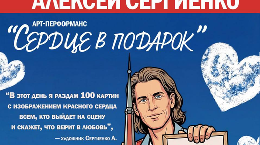 Более 10 лет художник Алексей Сергиенко дарит картины с изображением красного сердца ❤️ на 14 февраля. 🤗 В этом году перформанс «Сердце в подарок» будет проходить в Сочи в галерее «Форт». (https://t.me/FORTsochi) Благодарим Ксению, владелицу галереи за поддержку акции. ☀️ Медиа-продюсером мероприятия стал Алексей Ковалёв – инфлюенсер и лидер мнения, с аудиторией 8+ млн подписчиков...