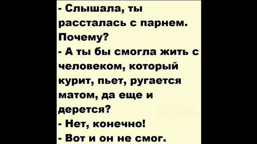 *** Экстрасенс умел читать мысли. Но проиграл в покер блондинке, которая не умела думать. *** - Ты сегодня какая-то раздражённая. Может, тебе стоит найти себе мужчину? - Да, есть один парень, который мне нравится, но он ужасно глупый и ничего не понимает. - Интересно, кто это? - Его зовут Саша. - О, тёзка. Я тоже Саша. *** — Твой «Ягуар» возле подъезда стоит? — Допустим, мой. — Можно я допью? *** Глухой вор проник в гараж и обнаружил там рок-группу. *** Жена отправляет мужа, который работает программистом, в магазин: — Купи батон, а если есть яйца, то десять штук...