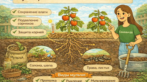 Здоровье почвы и стабильный рост растений во многом зависят не только от полива и подкормок, но и от того, насколько грамотно сохраняется влага и структура грунта. Одним из самых эффективных и при этом простых агроприёмов является мульчирование. Как эксперты магазина Семяныч.ру, мы рекомендуем использовать мульчу как обязательный элемент ухода, особенно при выращивании растений из семян. Мульчирование — это покрытие поверхности почвы вокруг растений специальным слоем органических или неорганических материалов...