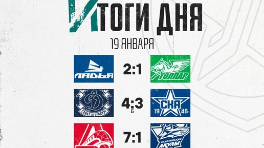 Сегодня, 19 января, состоялись шесть матчей регулярного Чемпионата Молодежной хоккейной лиги. «Ладья» одержала двенадцатую победу подряд, «Динамо СПб» взяло реванш у «СКА-1946», «Алмаз» уверенно обыграл «Тайфун». «Ладья» – «Толпар» - 2:1;
