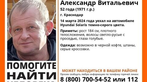 В Краснодаре волонтеры поискового отряда «Лиза Алерт» и близкие разыскивают бесследно пропавшего 52-летнего Александра Алтухова. Александр 14 марта уехал из дому на своей машине Hyundai Solaris темно-серого цвета, и с тех пор его никто не видел. На связь мужчина уже двое суток не выходит. - Приметы: рост 184 см, плотного телосложения, волосы светло-русые, с проседью, глаза голубые...