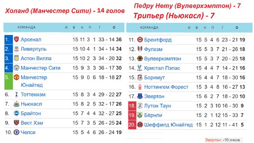 Это 15 тур английской премьер-лиги. Пришло много интересных новостей. Начинаю обзор с результатов, а затем плавно перейдём к расписанию и таблице. Главной новостью стало поражение Манчестера Сити в Бирмингеме от соседа по таблице Астон Виллы - 0:1. Испанский тренер Унаи Эмери переиграл испанца Гвардиолу. Единственный гол на счету ямайского полузащитника Леона Бейли. Это 3-е поражение «горожан» в АПЛ. Ранее их обыграл Вулверхэмптон и Арсенал. МЮ обидел Челси 2-1. Получаем, что голландский наставник тен Хааг почетно одолел аргентинца Почеттино...