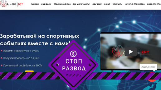 AnaliticBet(analiticbet.ru) – это якобы команда спортивных аналитиков, которая работает на благо простых людей, чтобы они могли делать ставки на спорт и зарабатывать на этом. Что предлагает компания Как утверждают в Analitic BET, их команда постоянно обрабатывает огромные объемы спортивной статистики, с целью поиска закономерностей и последующего составления спортивных прогнозов. Однако мы вас огорчим. Любой математик скажет вам, что ставки – это игра с отрицательным математическим ожиданием. В ней невозможно остаться в долгосрочном выигрыше...