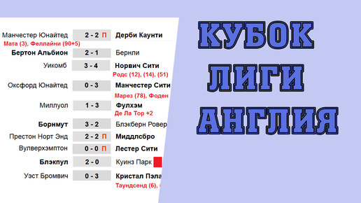 Всем привет, посмотрим в этом выпуске результаты кубка английской лиги, надеюсь они вам будут интересны, это стадия 1/16, начнем ой ёй ёй, Манчестер Юнайтед проиграл Дерби Каунти в серии пенальти. Хуан Мата забил уже на 3 минуте, а Феллайни спас Манчестер на 95й. Игра перешла в дополнительное время, а затем в серию пенальти, которую выиграл Дерби. В прошлом выпуске про Чемпионат Англии, я говорил уже, что Манчестер не предсказуем, и может даже проиграть в следующей игре. Возможно, это и тактика Моуриньо, который хочет избавить свой клуб от лишних турниров...