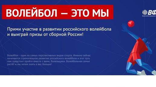 Всероссийская федерация волейбола проводит опрос на тему волейбола. Среди тех, кто заполнит анкету, ВФВ разыграет игровые мячи с автографами волейболистов сборной России, а также главный приз - игровую футболку сборной России Ответить на вопросы можно на сайте family...